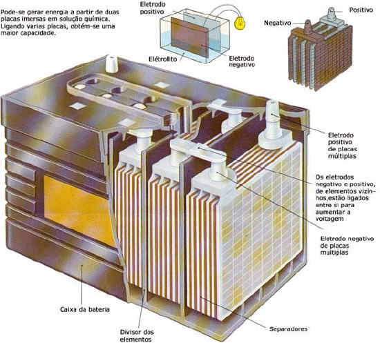A trem do automóvel se constitui de um conjunto de placas de chumbo, com polo crédulo e um polo vão, como uma saque. Essas placas ficam cobertas pela esqueleto plástica e vão acumulando a força para seu desempenho, criada a partir de processos químicos.